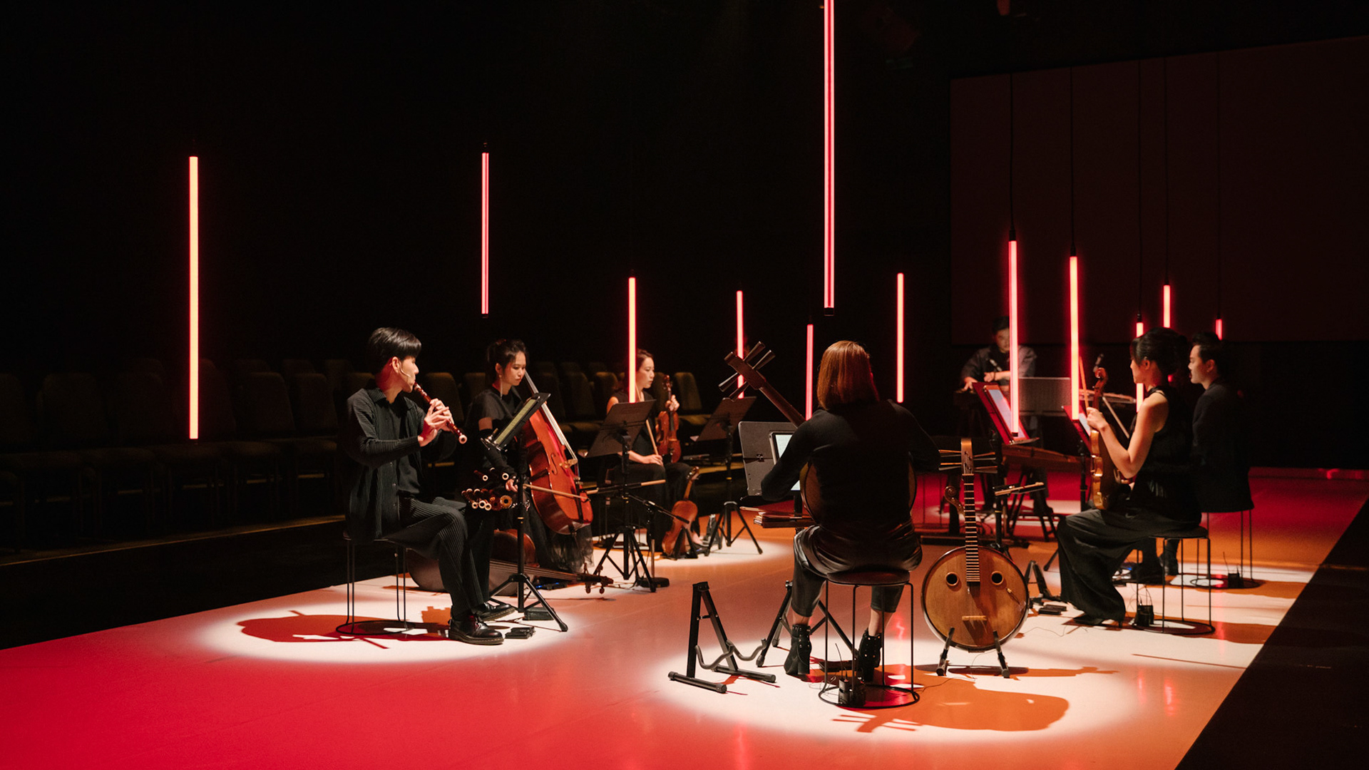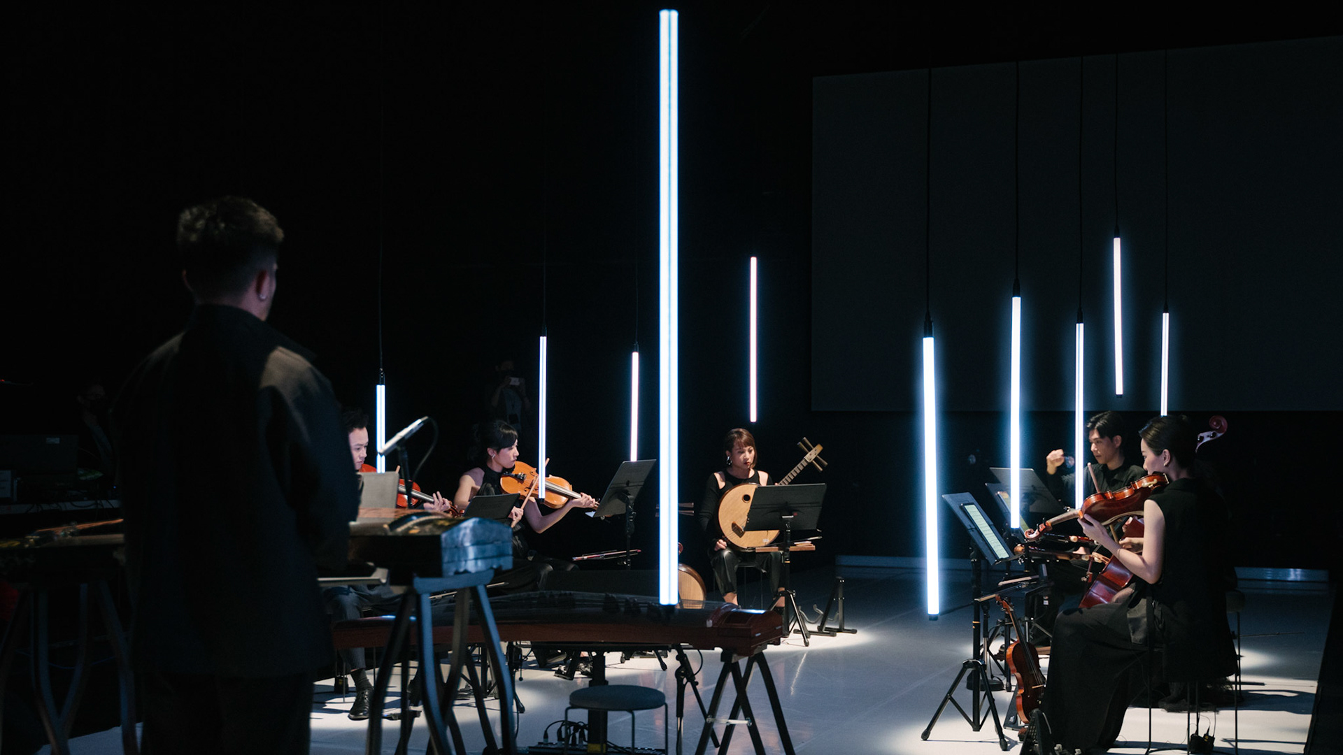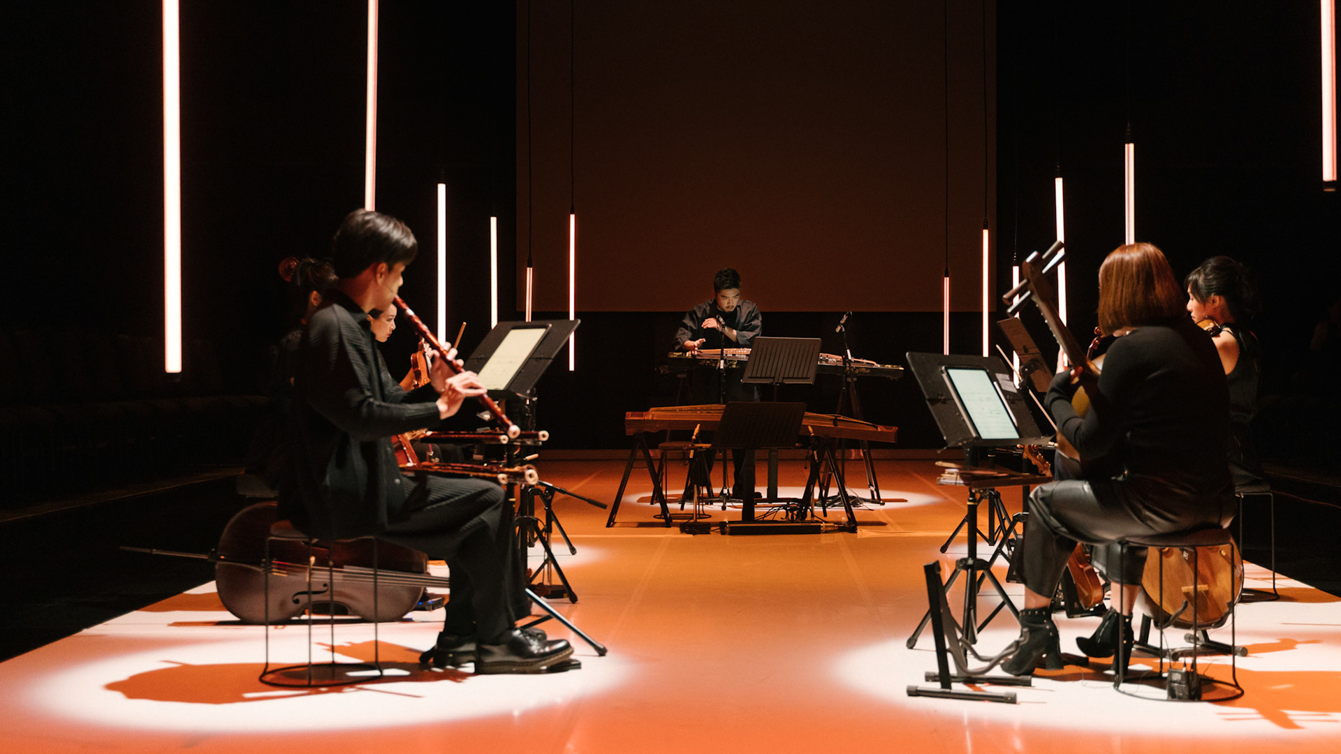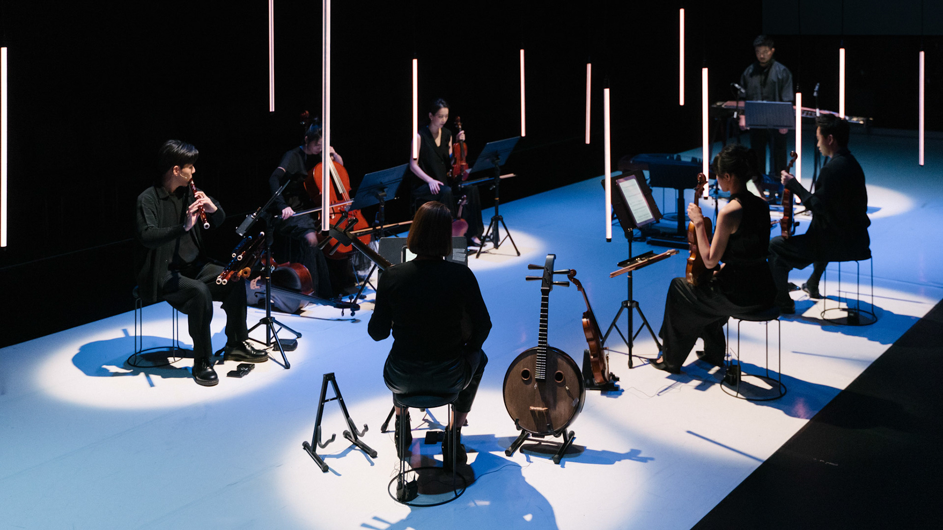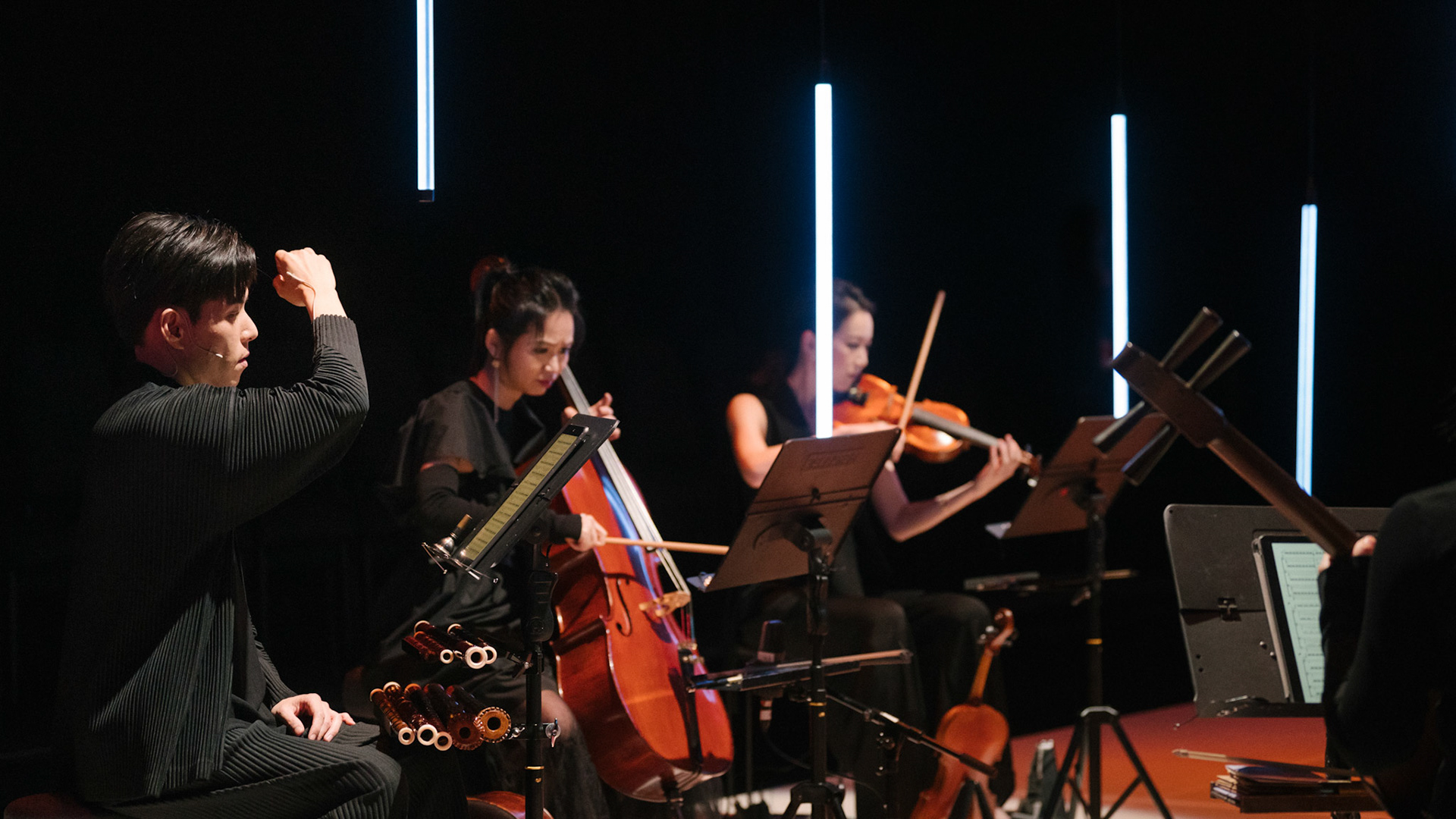 主創團隊|三個人 古箏/郭靖沐、笛簫/任重、阮/潘宜彤 弦樂四重奏|小提琴/張家倫、曾敏青、中提琴/江婉婷、大提琴/張智惠 作曲|呂佾庭《瓶中花》、林煒傑《众・㠭》、黃苓瑄《催化》 合作視覺藝術家|李浩 合作舞蹈藝術家|林春輝(小得) 舞臺設計|謝均安 燈光設計|簡芳瑜 服裝設計|林玉媛 舞台監督|張婷婷 音場設計|溫承翰 影像技術|田子平 製作人|蘇庭睿 執行製作|徐儷慈 劇照攝影|陳宥中